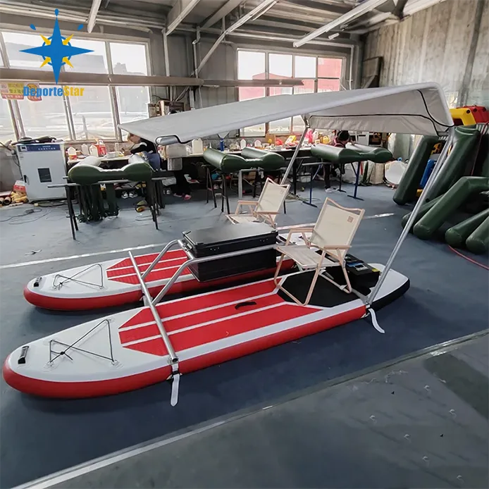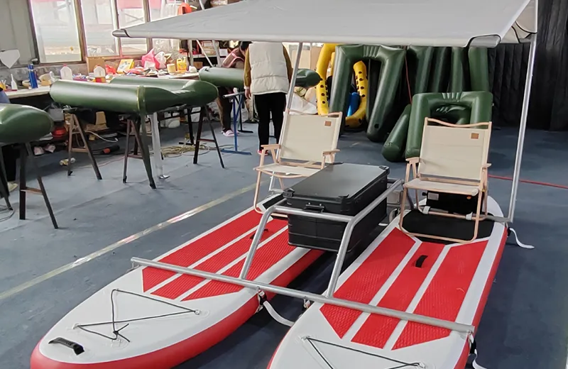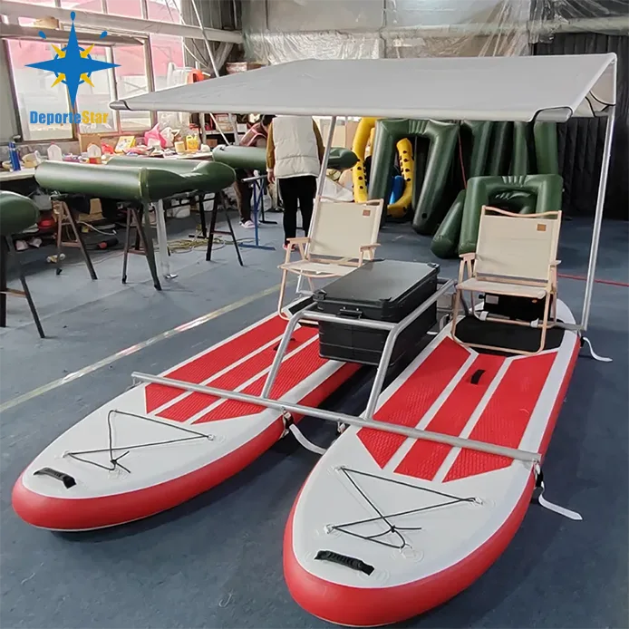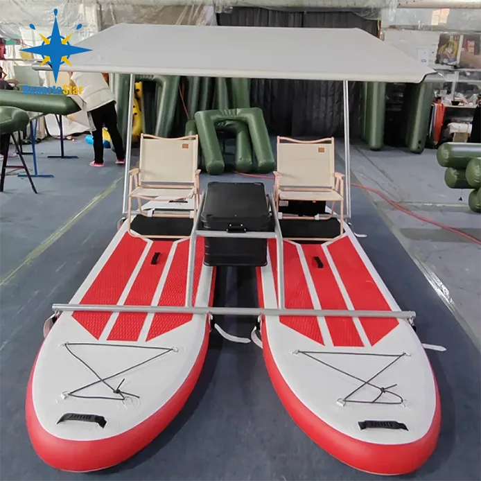 1. Einzigartiges Design: - Surfbrett aus leichtem PVC-Rohr (Drahtpolster) mit Aluminiumrahmen oder Rahmen aus rostfreiem Stahl. Die für Stabilität und Manövrierfähigkeit auf dem Wasser sorgen. Die stromlinienförmige Form dieses aufblasbaren Katamarans verringert den Wasserwiderstand.